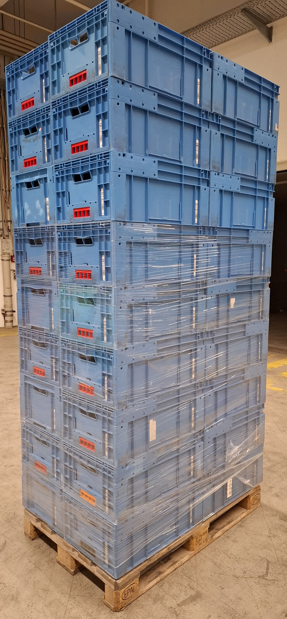 Die Behälter sind sortenrein auf Paletten gestapelt (ca. 1,5m hoch).
